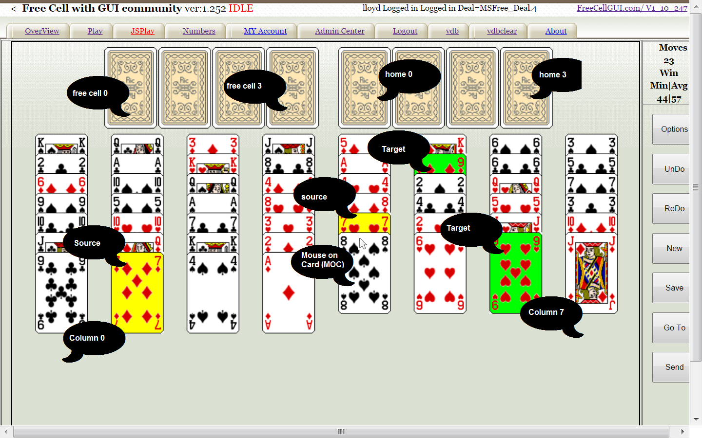 When the mouse is on a card (MOC) the cards that are a target (cards that MOC can be played on) an for which MOC is a target (source, cards that can be moved to MOC) are highlighted with colors. Green for target cards and yellow for source cards. When mouse is move over an empty Home cell all the Aces that are not in Home are colored green. See Figures 0 , 1, and 2. If Ctrl is pressed all the cards of the same rank as MOC are colored green. These functions assist in planning moves.