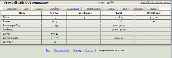 To play JSFreeCell you must be a registered user. Registration requires a User Name to be used to report your statistics and achievements , password to secure the right to record statistics under your User Name, and an Email Address which is used to send you a new password, if you forget your current password, and to notify you of successful registration and other communication about your account. Both the User Name and Email Address are case insensitive, but the Email Address, when reentered to authorize lost password recovery, is case sensitive and must be entered exactly as it was entered when Registering or Editing Account.